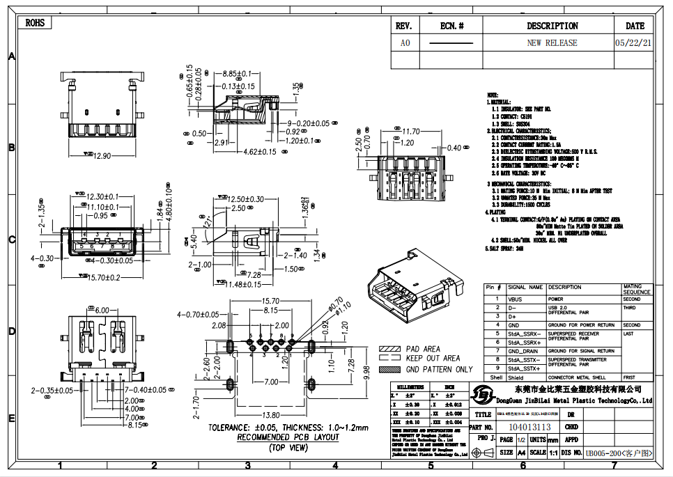 104013113-usb3.0母座 反沉1.36 斜口四插腳黑膠連接器 USB3.0插座母頭