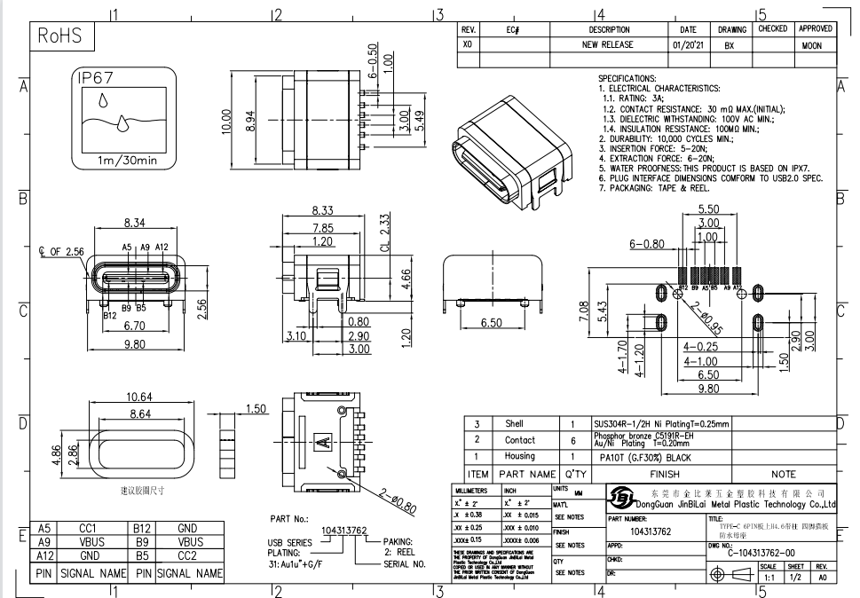 • 104313762-TYPE-C防水母座 6P板上H4.6