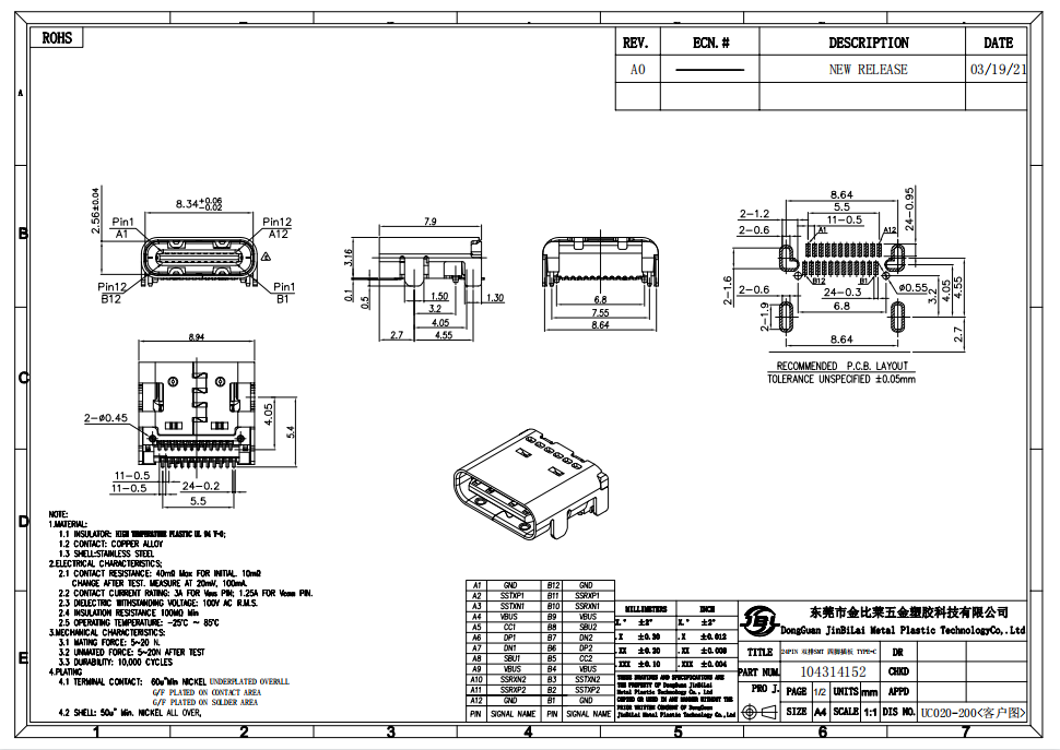 • 104314152-TYPE-C 24P母座閃電快充帶柱 H0.8 雙排板上貼片連接器