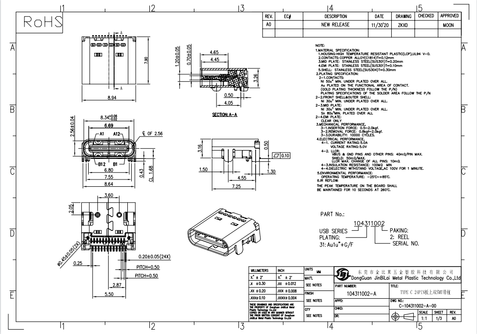 104311002-A -USB type-c母座 24P板上雙貼連接器